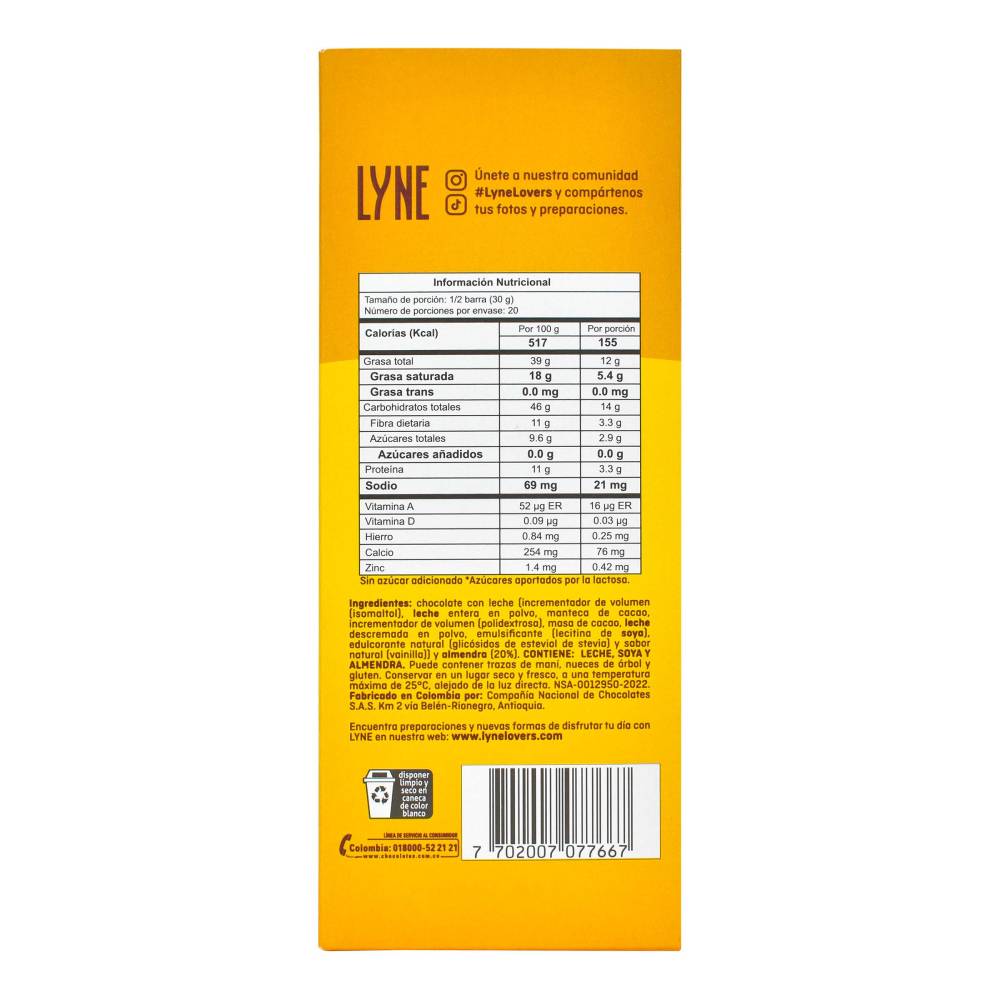 La Chocolatina Lyne Almendras no solo satisface el antojo de algo dulce, sino que también aporta un toque de elegancia a tus momentos de indulgencia. Ideal para quienes buscan un snack que combine placer y calidad, este producto es una opción que no puede faltar en tu despensa. Disfruta de la experiencia única que ofrece cada chocolatina y déjate llevar por su irresistible sabor.