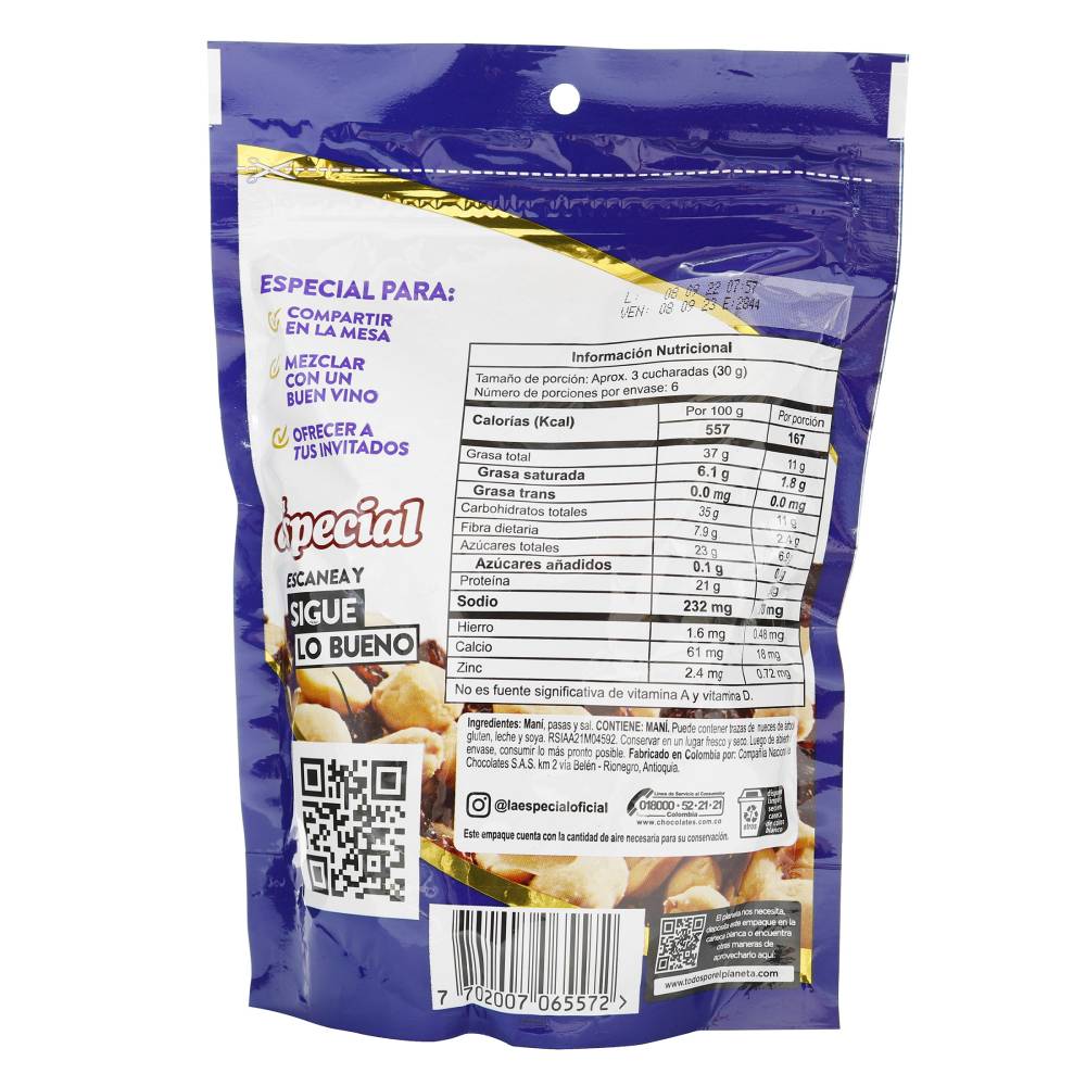 Descubre el Pasabocas Especial Mix Pasas de La Especial, una deliciosa combinación de frutos secos y deshidratados que te ofrece un sabor inigualable. Este producto, presentado en un práctico paquete de 180 g, es ideal para quienes buscan un snack saludable y nutritivo en cualquier momento del día.