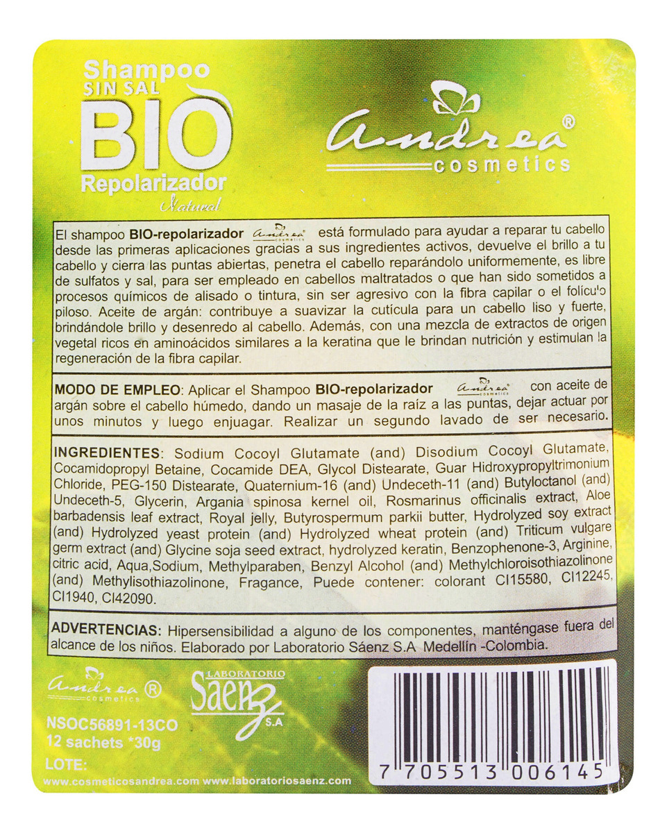 Recibes SHAMPOO SIN SAL ANDREA BIO REPOLARIZADOR 12 SOBRES