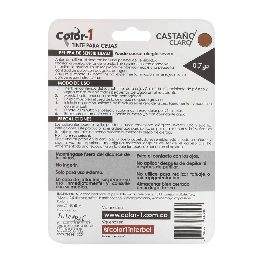 El Tinte Color-1 Para Cejas en tono Castaño Claro 0.7 g es la solución perfecta para quienes buscan realzar la belleza de su mirada de manera sencilla y efectiva. Con una fórmula semi permanente que otorga una cobertura completa de canas, este tinte se adapta a tus necesidades de un tono natural y armónico que complementa tu piel y cabello.
