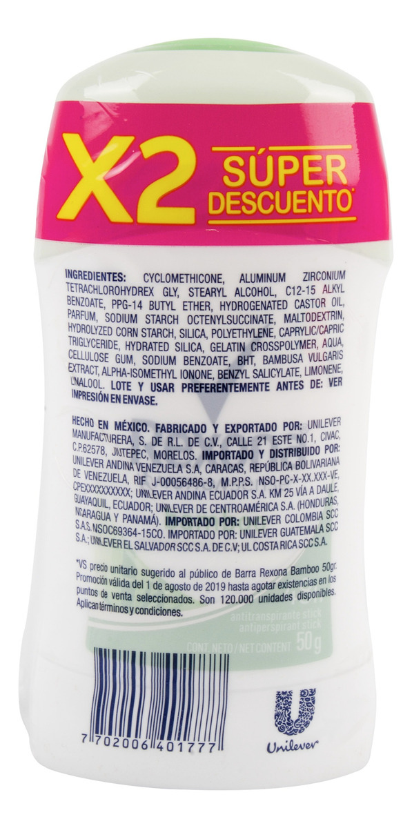 Recibes 2 DESODORANTES REXONA BAMBOO MUJER BARRA 50 GR C/U