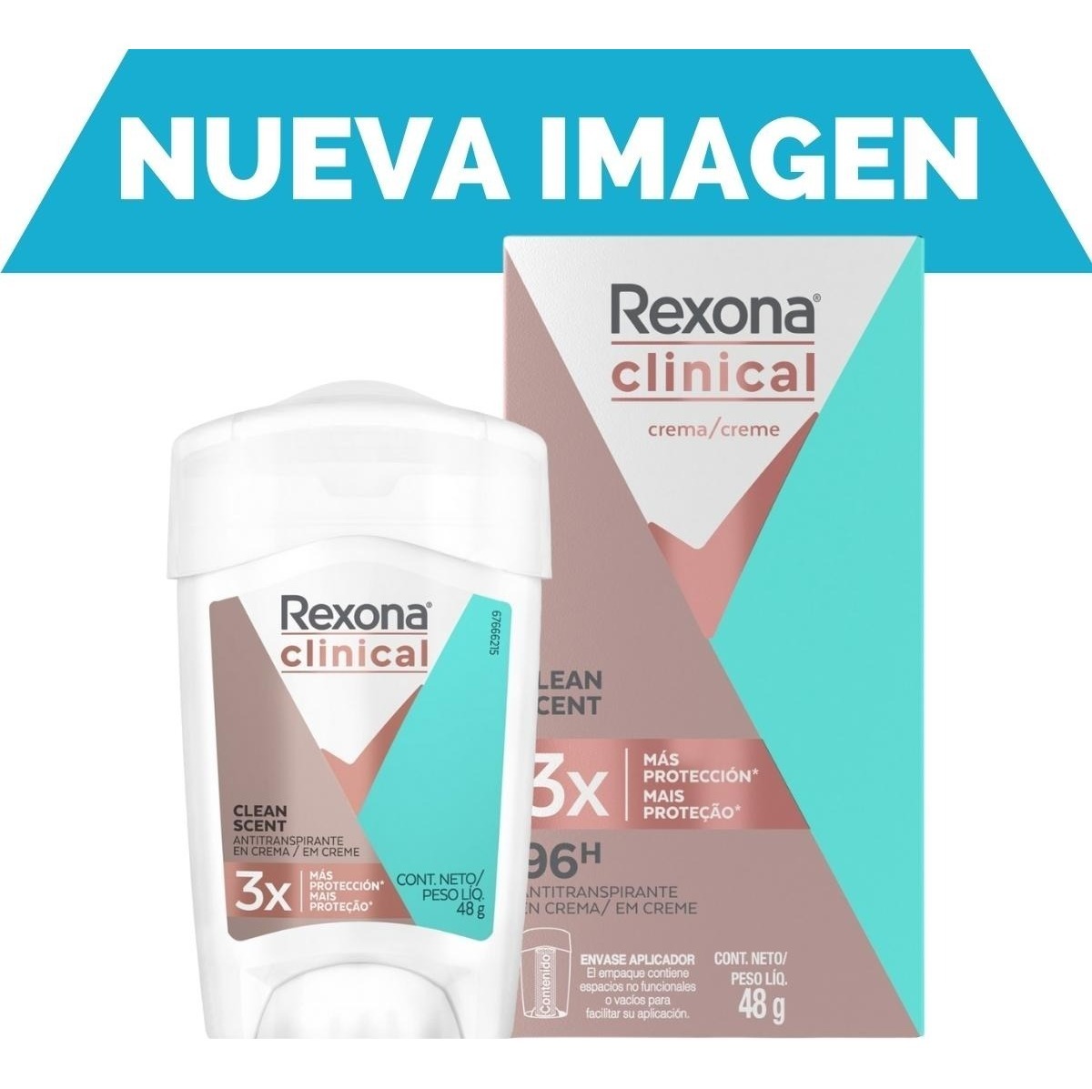 Recibes CINCO (5) Desodorantes Rexona Clinical Clean Scent Crema 48gr c/u.