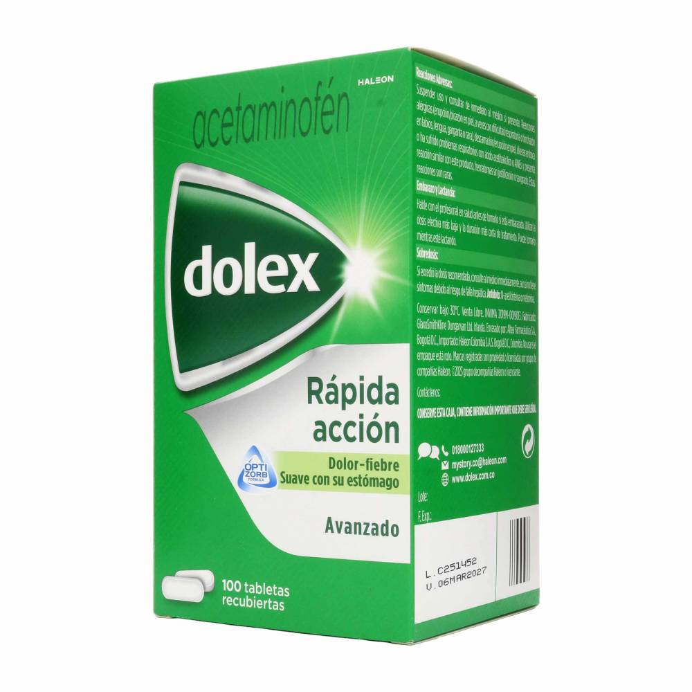 La eficacia de este analgésico cuenta con todo el respaldo científico del laboratorio Haleon. Además de su velocidad, Dolex Avanzado Rápida Acción destaca por ser un medicamento suave con su estómago cuando se utiliza según las indicaciones. Por esta razón, se convierte en la opción ideal para el botiquín familiar en su formato de 100 unidades, asegurando tener siempre a mano un tratamiento confiable para la fiebre y el dolor leve a moderado.