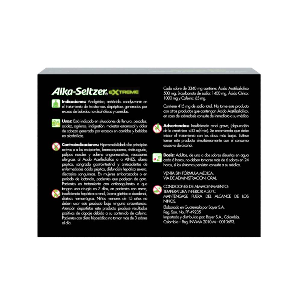 ¡Alivio extremo y rápido para la indigestión, el agror y el dolor de cabeza con Alka Seltzer Extreme ! Este práctico paquete contiene 8 sobres individuales de una fórmula efervescente potente diseñada para brindarte un alivio eficaz y veloz de múltiples síntomas.