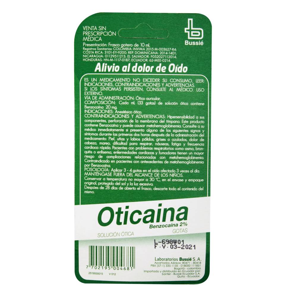 ALIVIO RÁPIDO PARA EL DOLOR DE GARGANTA: NUESTRAS GOTAS DE OTICAINA CONTIENEN BENZOÍNA, UN ANESTÉSICO LOCAL QUE ALIVIA RÁPIDAMENTE EL DOLOR E IRRITACIÓN DE LA GARGANTA. FÁCILES DE APLICAR Y CON UN EFECTO PROLONGADO, SON IDEALES PARA SITUACIONES COTIDIANAS DONDE NECESITAS UN ALIVIO SINTOMÁTICO INMEDIATO.