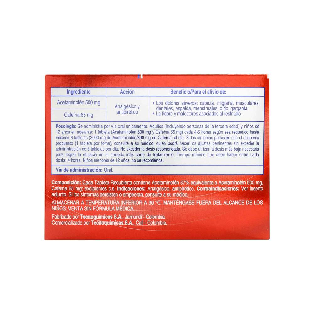 El Acetaminofén Forte es una opción confiable para el manejo del dolor, respaldado por el laboratorio Tecnoquímicas, reconocido por su compromiso con la calidad y la salud. Con un empaque que asegura la integridad del producto, cada tableta está diseñada para ofrecer un alivio efectivo y duradero.