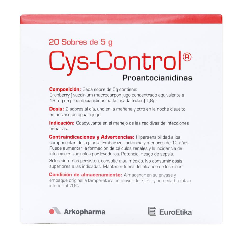 ¡RECUPERA TU BIENESTAR URINARIO DE FORMA NATURAL! CYS CONTROL ES UN COMPLEMENTO ALIMENTICIO A BASE DE ARÁNDANO ROJO AMERICANO, BREZO Y D-MANOSA, INGREDIENTES NATURALES QUE AYUDAN A PREVENIR Y ALIVIAR LOS SÍNTOMAS DE LA CISTITIS Y OTRAS INFECCIONES URINARIAS. SU FÓRMULA ÚNICA ACTÚA INHIBIENDO LA ADHESIÓN DE LAS BACTERIAS A LAS PAREDES DE LA VEJIGA, FAVORECIENDO SU ELIMINACIÓN Y ALIVIANDO LAS MOLESTIAS. ¡SIÉNTETE ALIVIADO Y RECUPERA TU CONFORT URINARIO! IDEAL PARA MUJERES QUE SUFREN DE CISTITIS RECURRENTE O QUE BUSCAN UNA ALTERNATIVA NATURAL PARA EL CUIDADO DE SU TRACTO URINARIO. ¡CUIDA TU SALUD URINARIA CON CYS CONTROL! DISUELVE UN SOBRE EN UN VASO DE AGUA Y TOMA UNA VEZ AL DÍA, PREFERIBLEMENTE POR LA NOCHE.