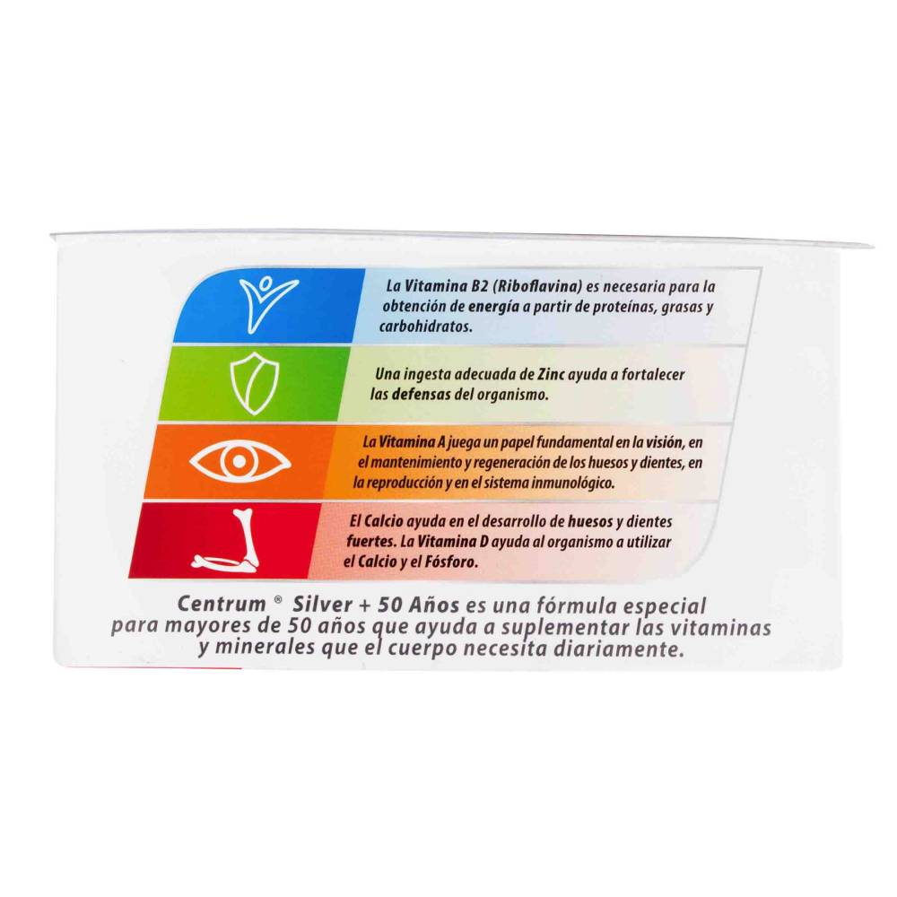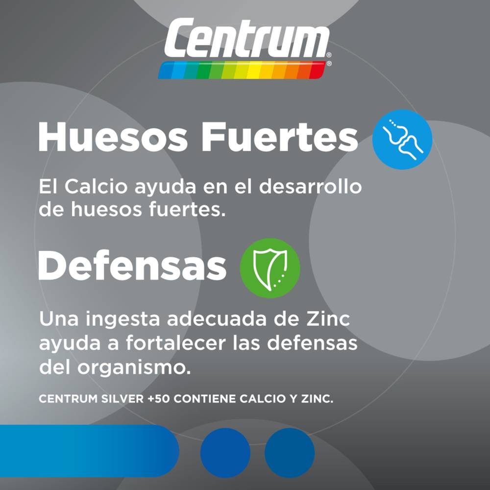 Proteja su vitalidad a largo plazo con Centrum Silver +50 Años. Este suplemento especializado para hombres y mujeres maduros, ofrece una mezcla experta de nutrientes que incluye Calcio, Zinc y Vitaminas A y B2 para apoyar su energía, visión, defensas y el desarrollo de huesos fuertes.