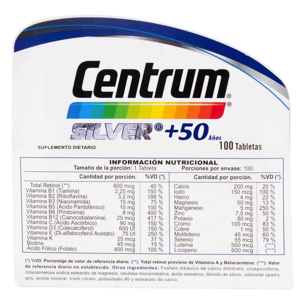 El uso de este suplemento representa una solución especializada para complementar la nutrición en la etapa madura de la vida. Por lo tanto, su fórmula contiene Vitamina B2, la cual es necesaria para la obtención de energía a partir de proteínas, grasas y carbohidratos. En consecuencia, al elegir Centrum Silver +50 Años, usted apoya activamente su vitalidad diaria de forma eficiente. Asimismo, la inclusión de Vitamina A juega un papel fundamental en la visión, además de participar en el mantenimiento de huesos y dientes.
