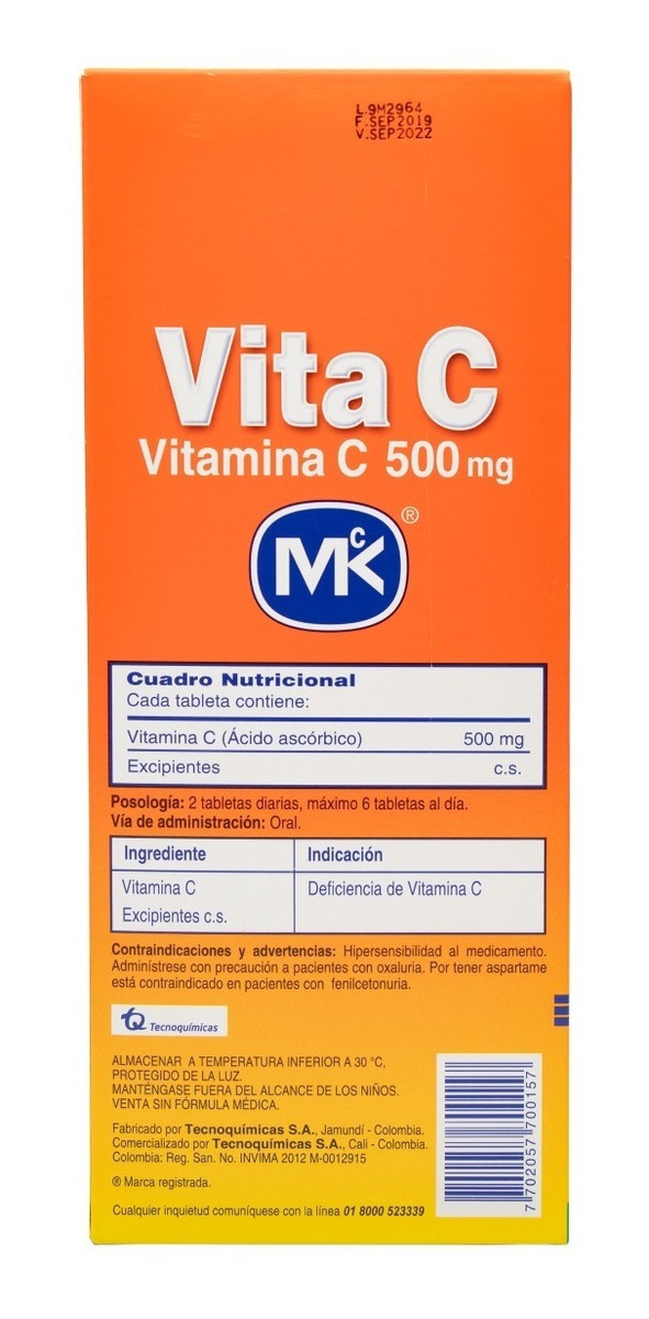 Vita C, Medicamento esencial. 2 tabletas diarias, máximo 6 al día. Hipersensibilidad al medicamento, adminístrese con precaución a pacientes con oxaluria.